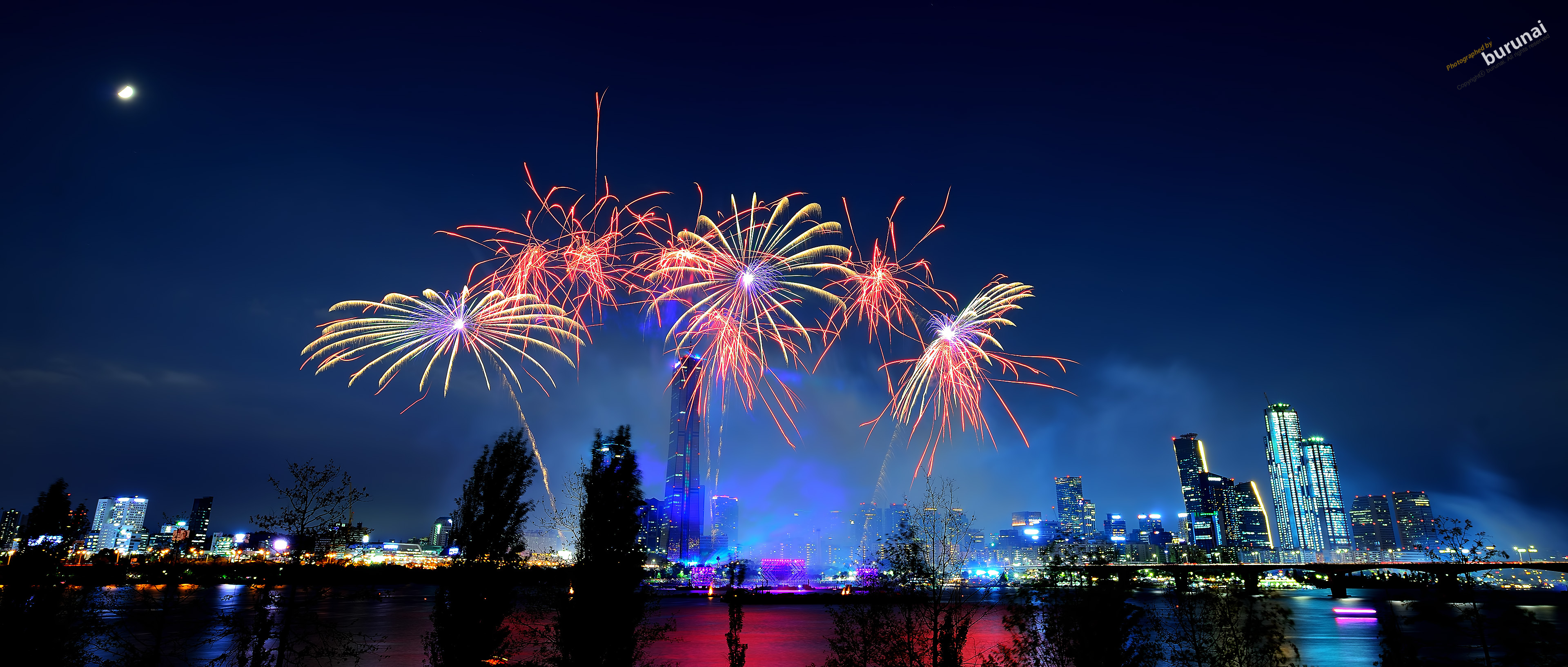 올해는 가족들도 전체를 다 볼 수 있는 곳에서 더 좋았다고 한다. 가을로 접어드는 밤하늘에 반달도 함께 불꽃을 빛내주었다. 4K화질로 불꽃축제에 못 오신분을 위해서 그 현장에서 몇장 담은 것 올려봅니다.