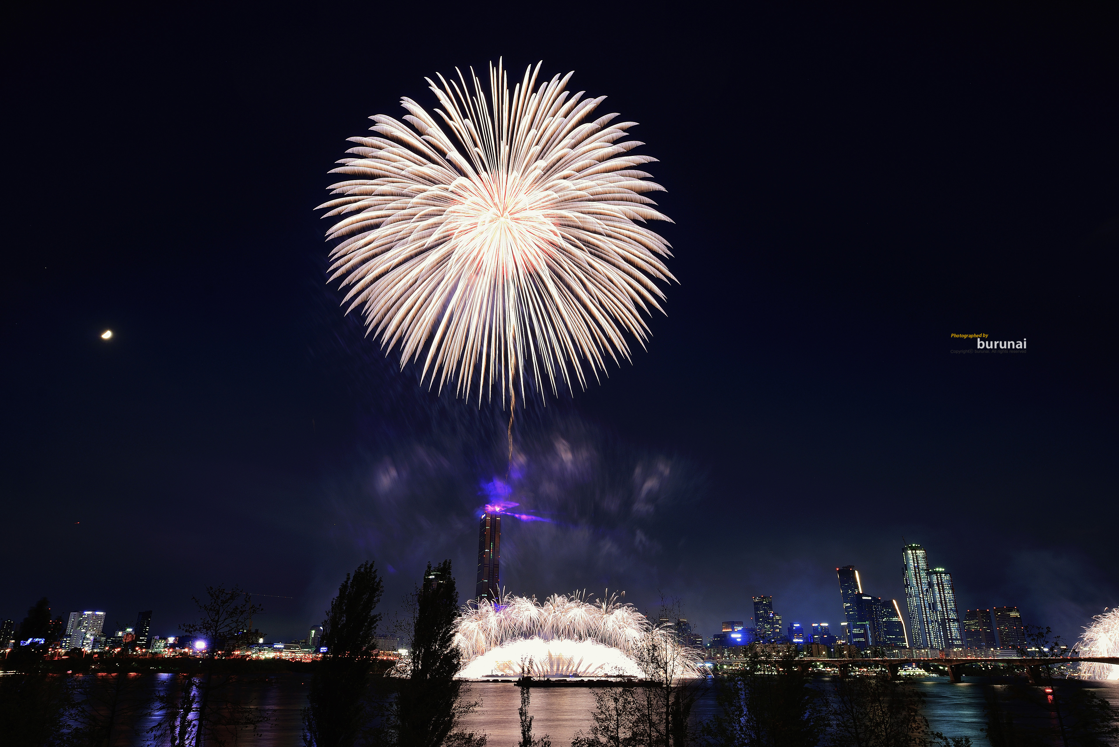 이건, 세팅에 따라서 촬영거리에 따라서 다를 수 있지만, 통상적으로 63빌딩 꼭대기에 촛점을 맞추면 문제 없습니다. 이때 바지선이 보인다면 바지선, 혹은 여의도 한강공원방면의 무대에 맞추면 됩니다. 저는 개인적으로 일단, 63빌딩 꼭대기 조명에 맞춥니다.
