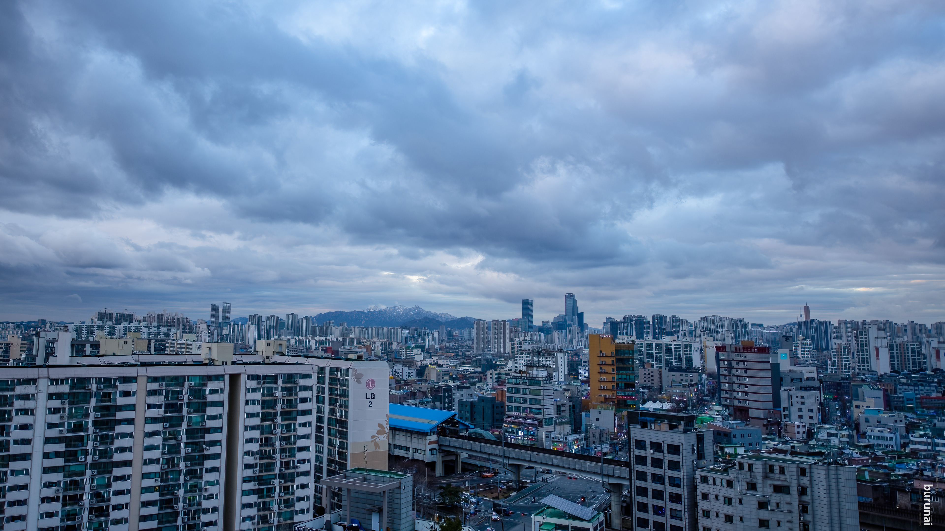 해가 갈 수록 베란다 풍경을 보면 북악산을 시작하여 아래로 강북쪽의 아기자기한 집들이 펼쳐졌는데, 이젠 중간에 아파트의 사각박스가 그 아기자기한 풍경을 감춰버리는 날이 왔다. 중간에 조금 아직 그 느낌을 보여준다.