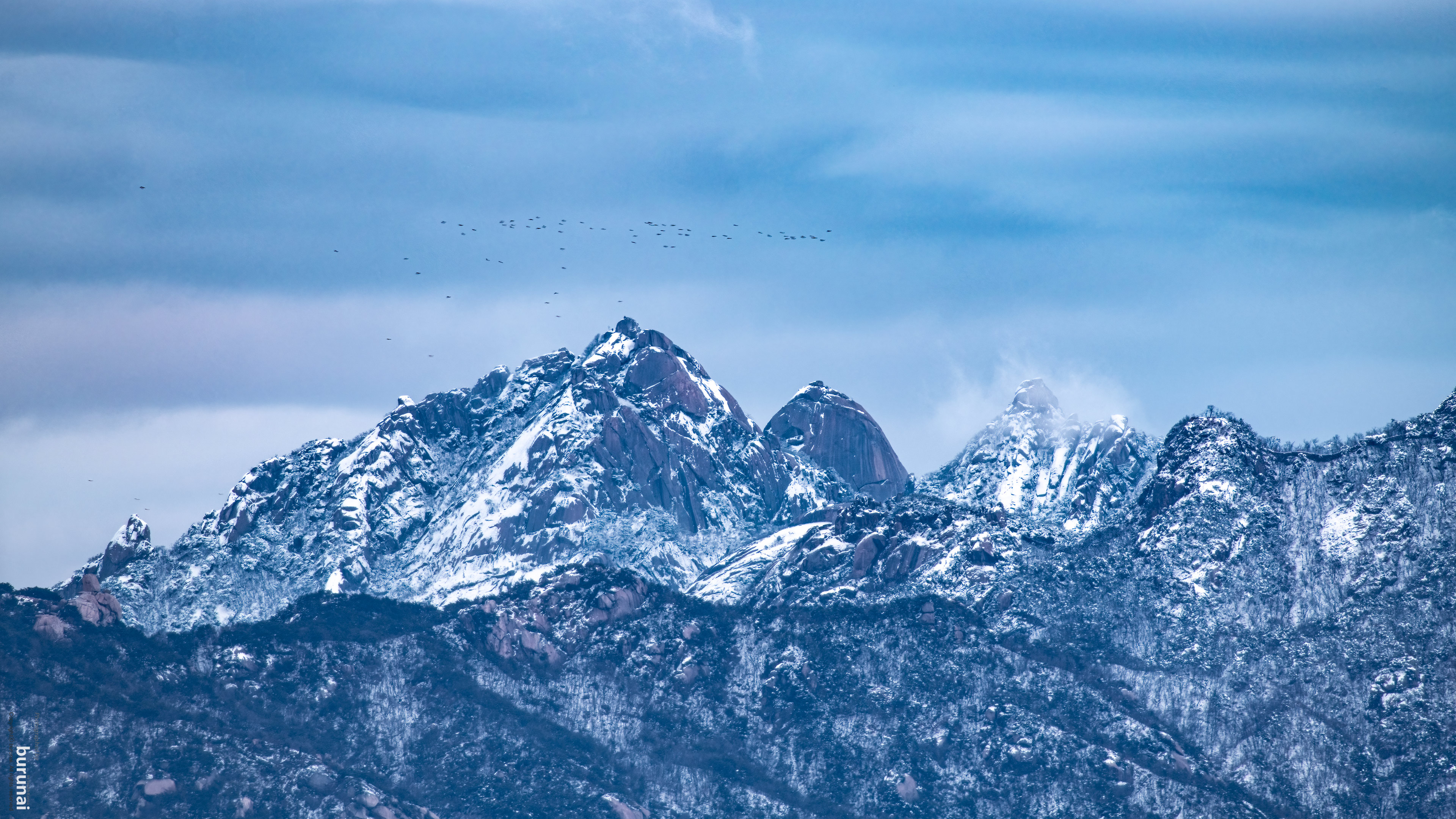그래도 대포를 꺼냈으니, 풍경이라도 한 컷 남기고 싶었는데, 쩜새 전문가 알고는 봉우리위를 날아다나는 새 무리를 만났다. 덕분에 산과 구름과 눈에 새가 더해져서 이러한 빛을 얻었다. ㅋㅋㅋ 마음만은 저새는 독수리야~ 하며 ㅋㅋㅋ