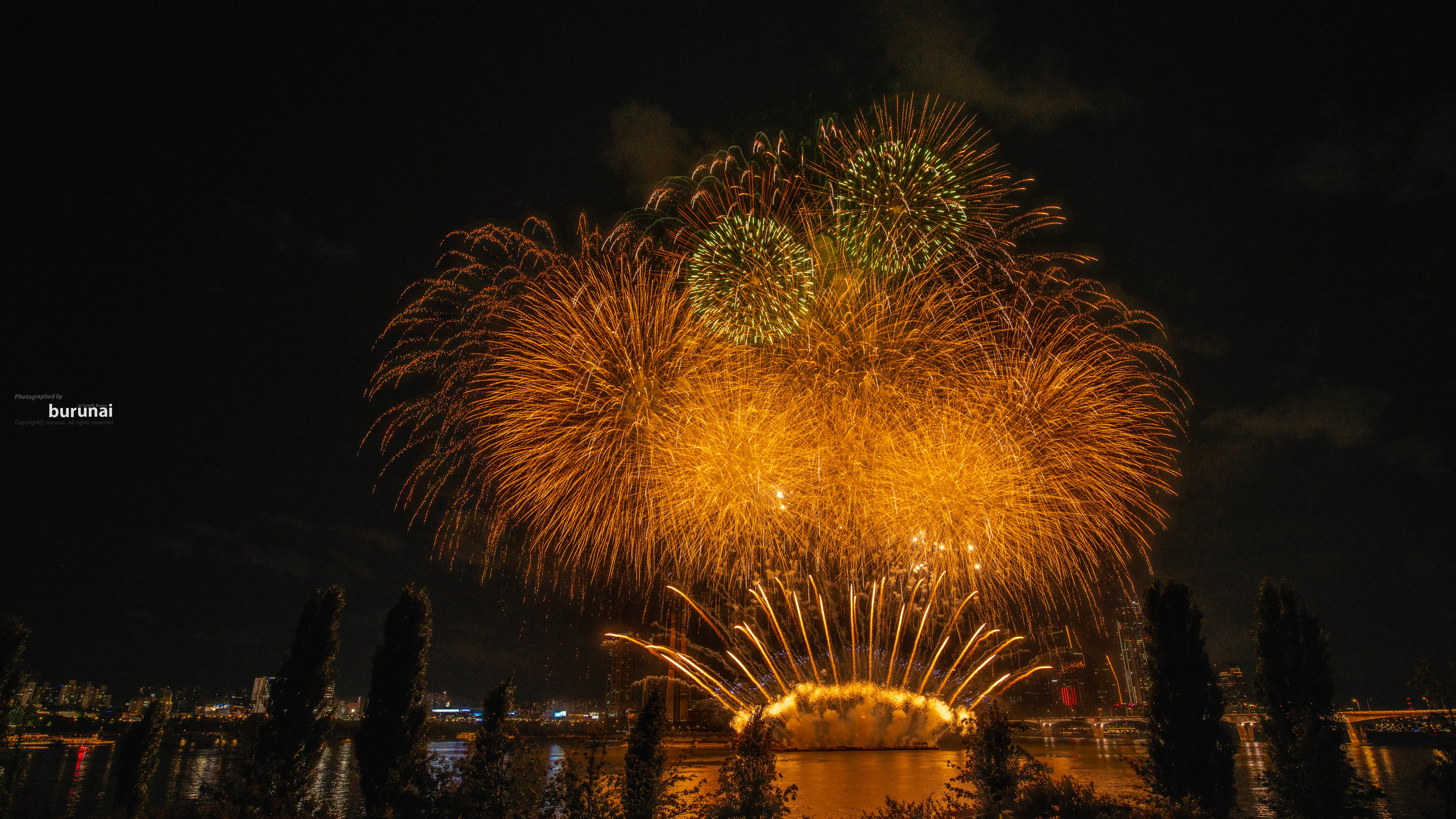 매년, 엄청난 화약이 폭발하면서 불꽃을 선사하는 타임이 있죠? 다들 화이트홀로 담지 못하는 헬게이트 열리게 하는 불꽃도 여러번 반복하니, 용써보니 이래 담기네요. 그 눈으로 간직했던 그 빛 묘한 배경과 함께 한강에 황금빛으로 물드리는게 이쁘네요. ㅋㅋㅋ