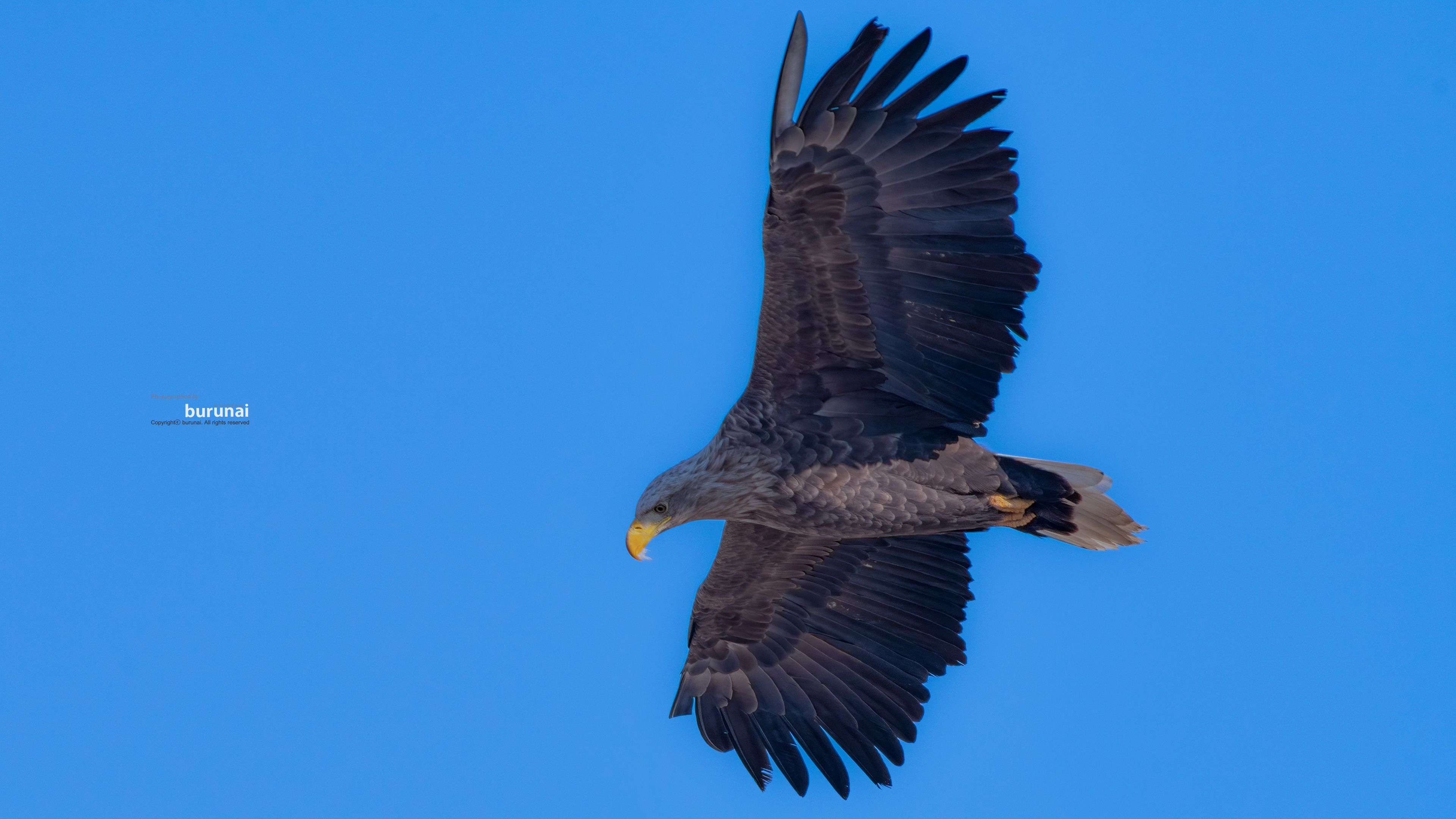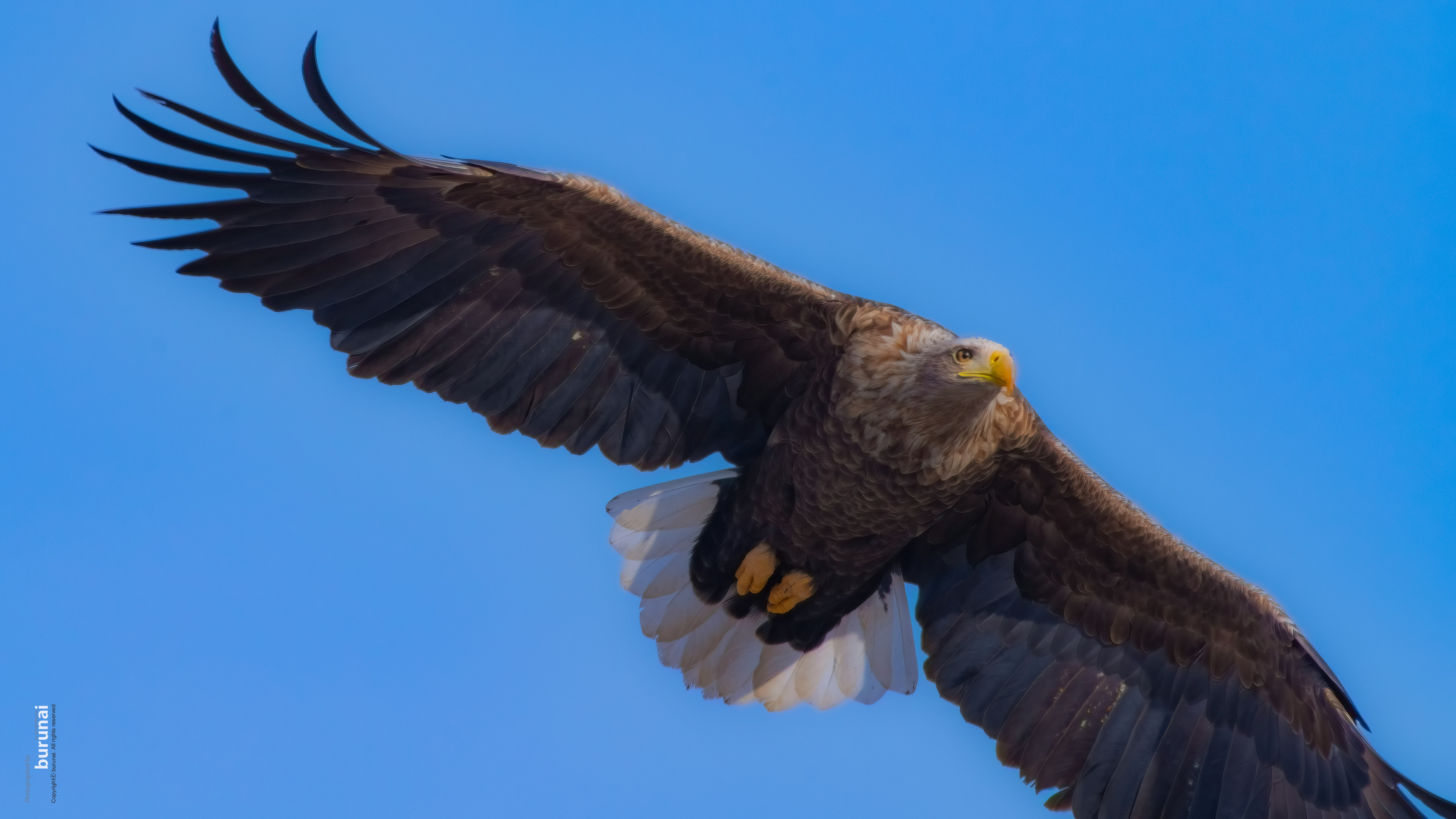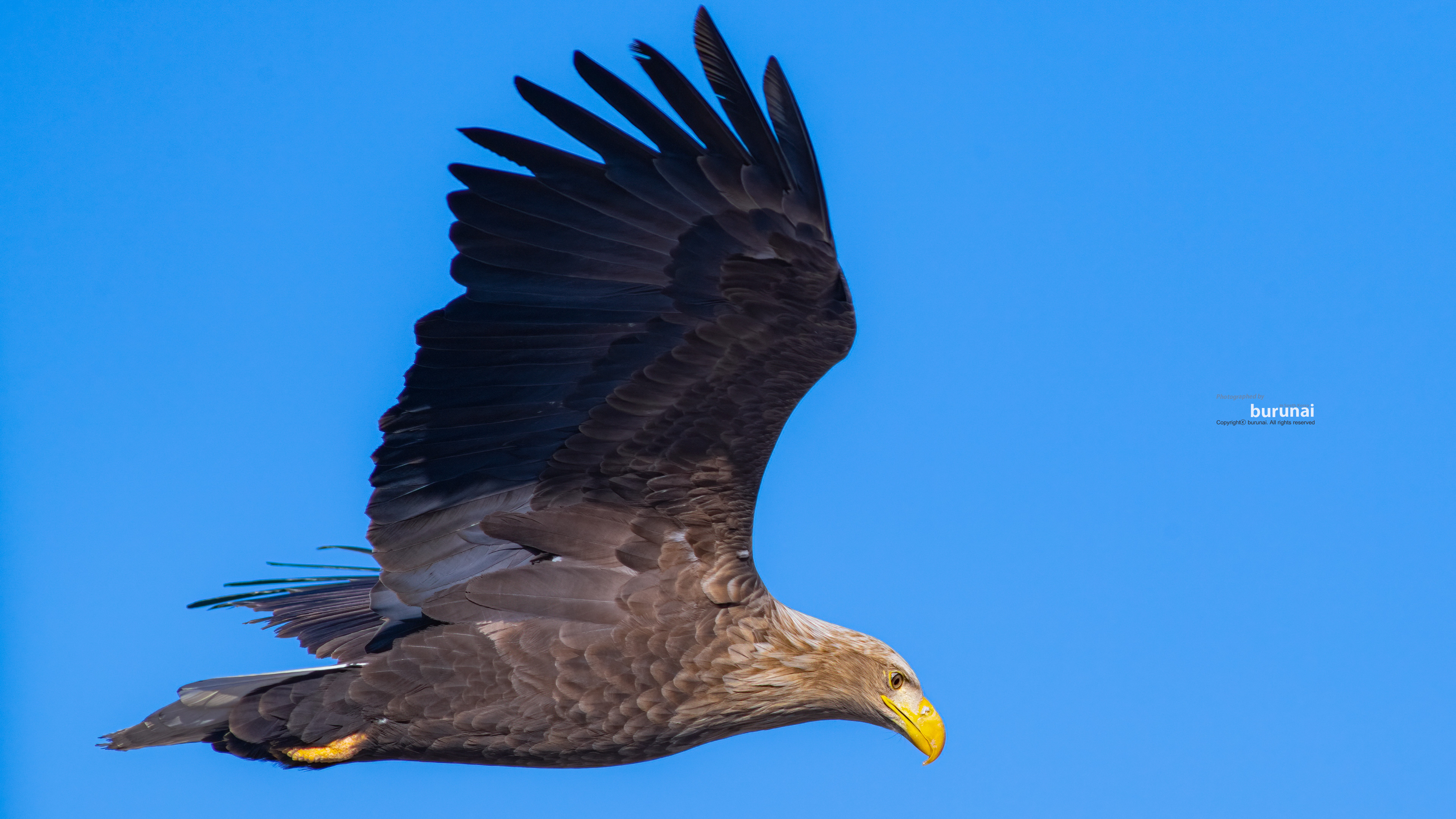 맑은날 푸른하늘배경으로 노랑색 부리와 갈고리, 그리고, 꼬랑지의 흰색이 있는 천연기념물 243-4호 흰꼬리수리의 성조